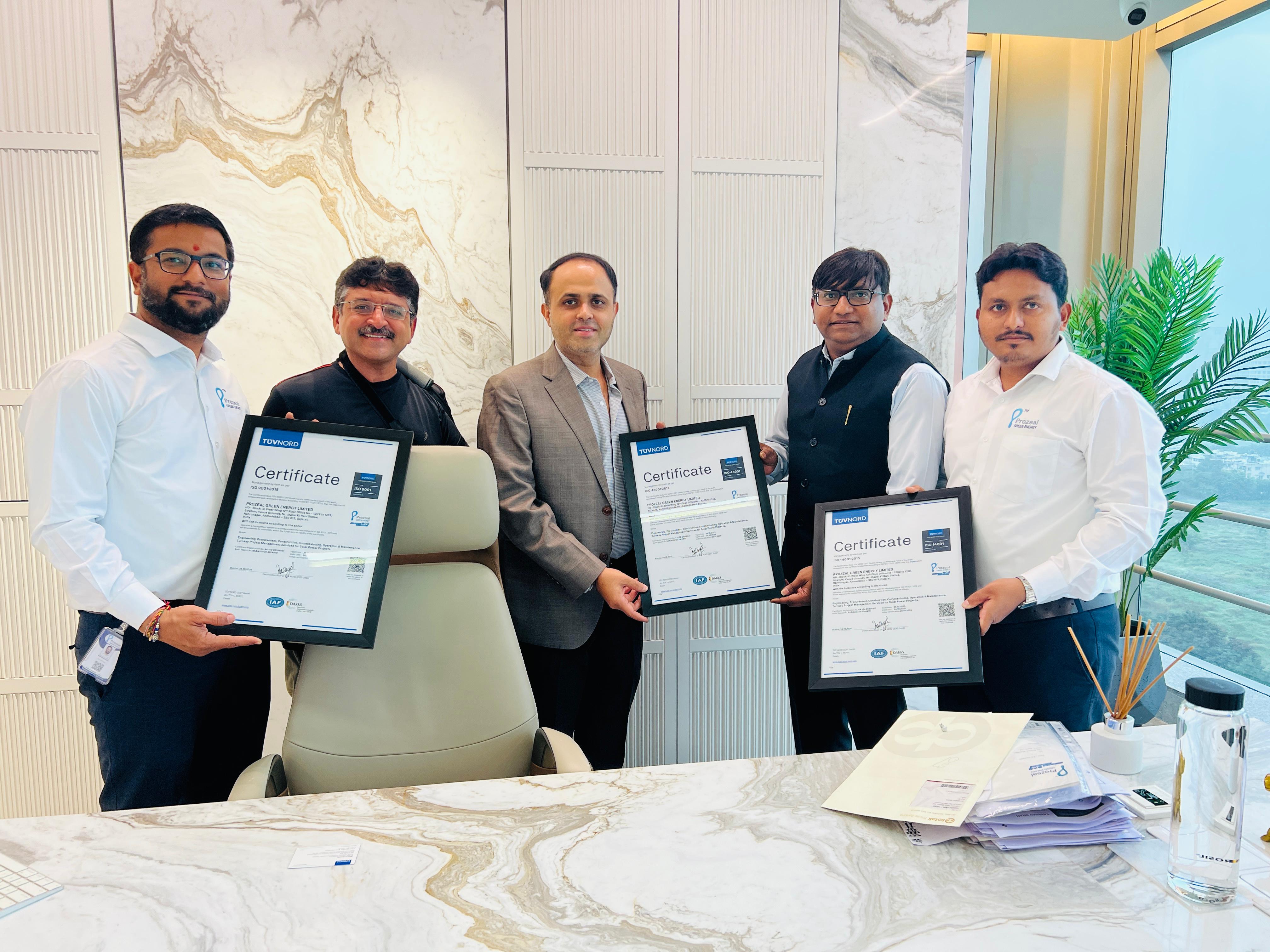 At Prozeal Green Energy, we take pride in achieving ISO 9001 (Quality Management), ISO 14001 (Environmental Management), and ISO 45001 (Occupational Health & Safety) certifications. This recognition underscores our commitment to maintaining global standards, ensuring operational excellence, and fostering a sustainable and safe workplace for our people and partners.